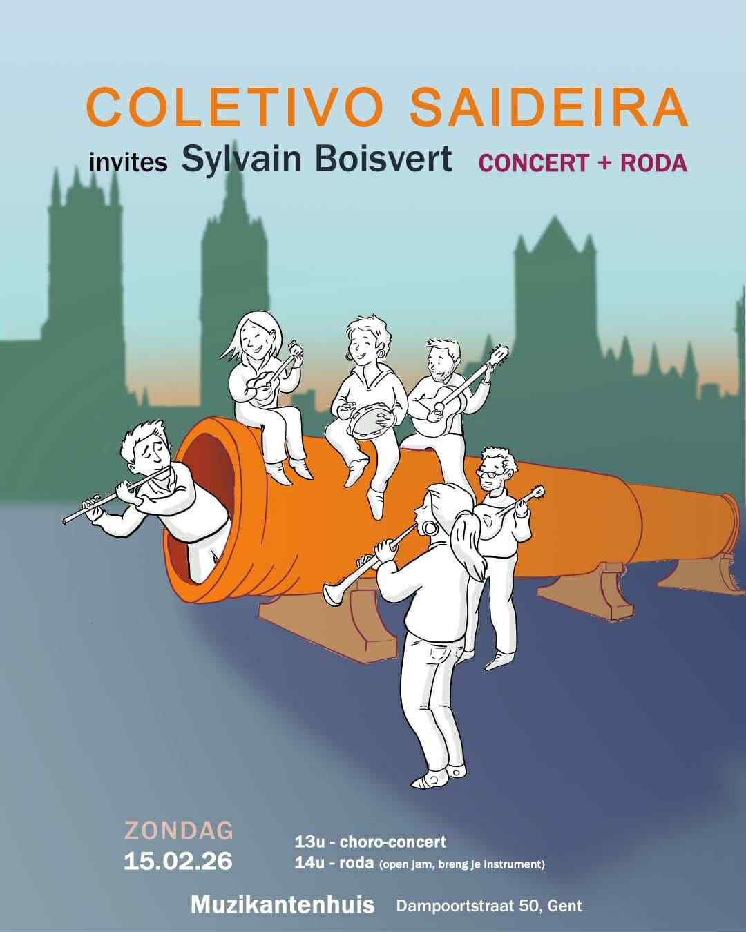 Concert + Roda "Coletivo Saideira invites Sylvain Boisvert" Coletivo Saideira is een nieuw choro-collectief gevestigd in Brussel. Ze brengen een mix van opzwepende en melancholische nummers uit deze rijke Braziliaanse instrumentale traditie. De "saideira" is het allerlaatste (bis)nummer dat op elk choro-bijeenkomst (roda) wordt gespeeld, maar meestal spelen we minstens vijf saideiras voordat we naar huis gaan. Choro is een muziktraditie die ontstaan is In de culturele smeltkroes van het 19e-eeuwse Rio de Janeiro. De muziek leeft nog steeds volop en heeft zich ver buiten de grenzen van Brazilië verspreid. Choro wordt gekenmerkt door het speelse samenspel tussen de muzikanten en omvat een verscheidenheid aan ritmes zoals maxixe, tango brasileiro, samba, wals, enz. Bandolim - Shalan Alhamwy Cavaquinho – Noriko Kadoya Klarinet – Rosa Iniesta Pandeiro - Christel Descornet 7-snarige gitaar – Bart Van Besien Te gast: Sylvain Boisvert - dwarsfluiten